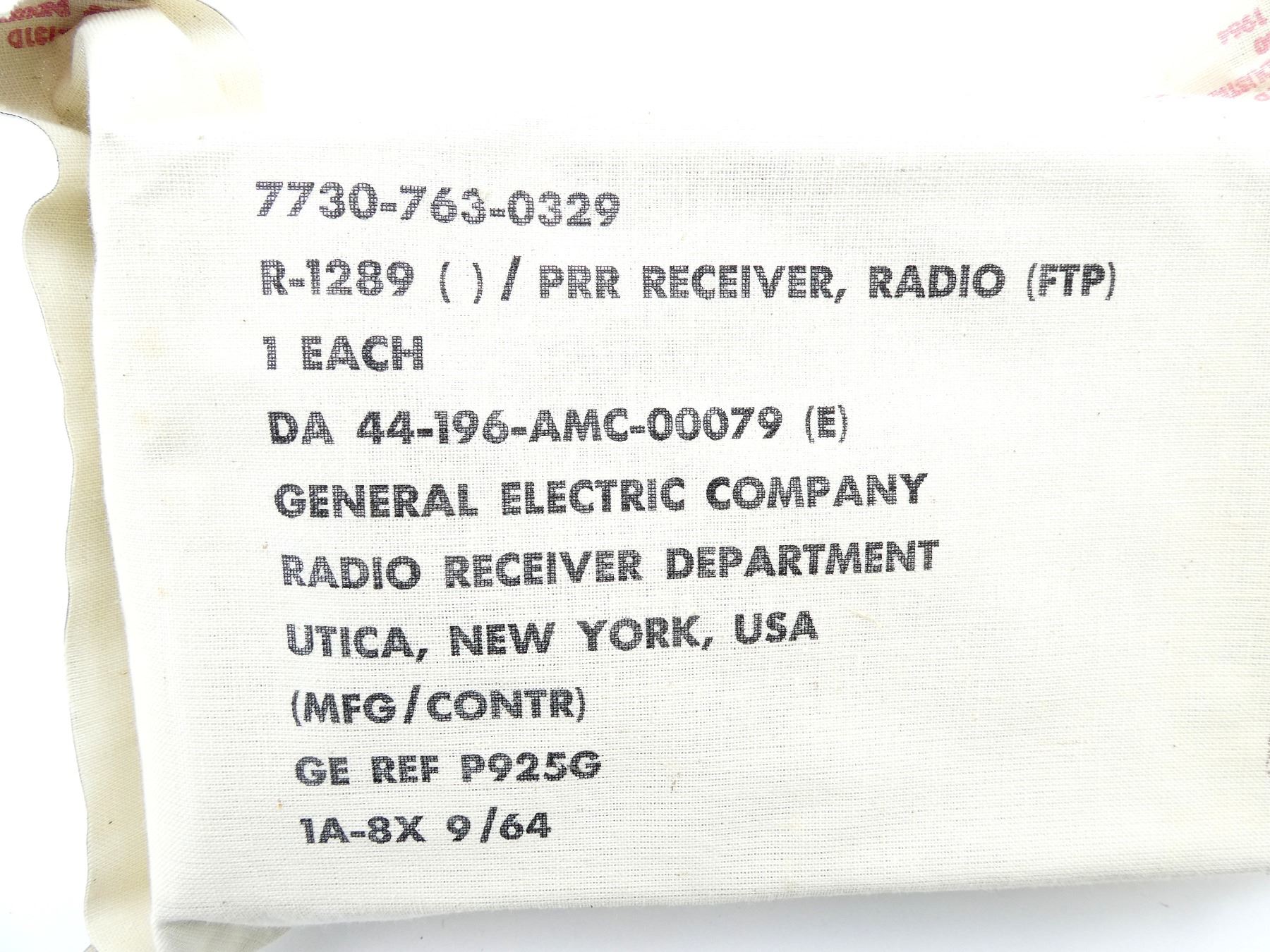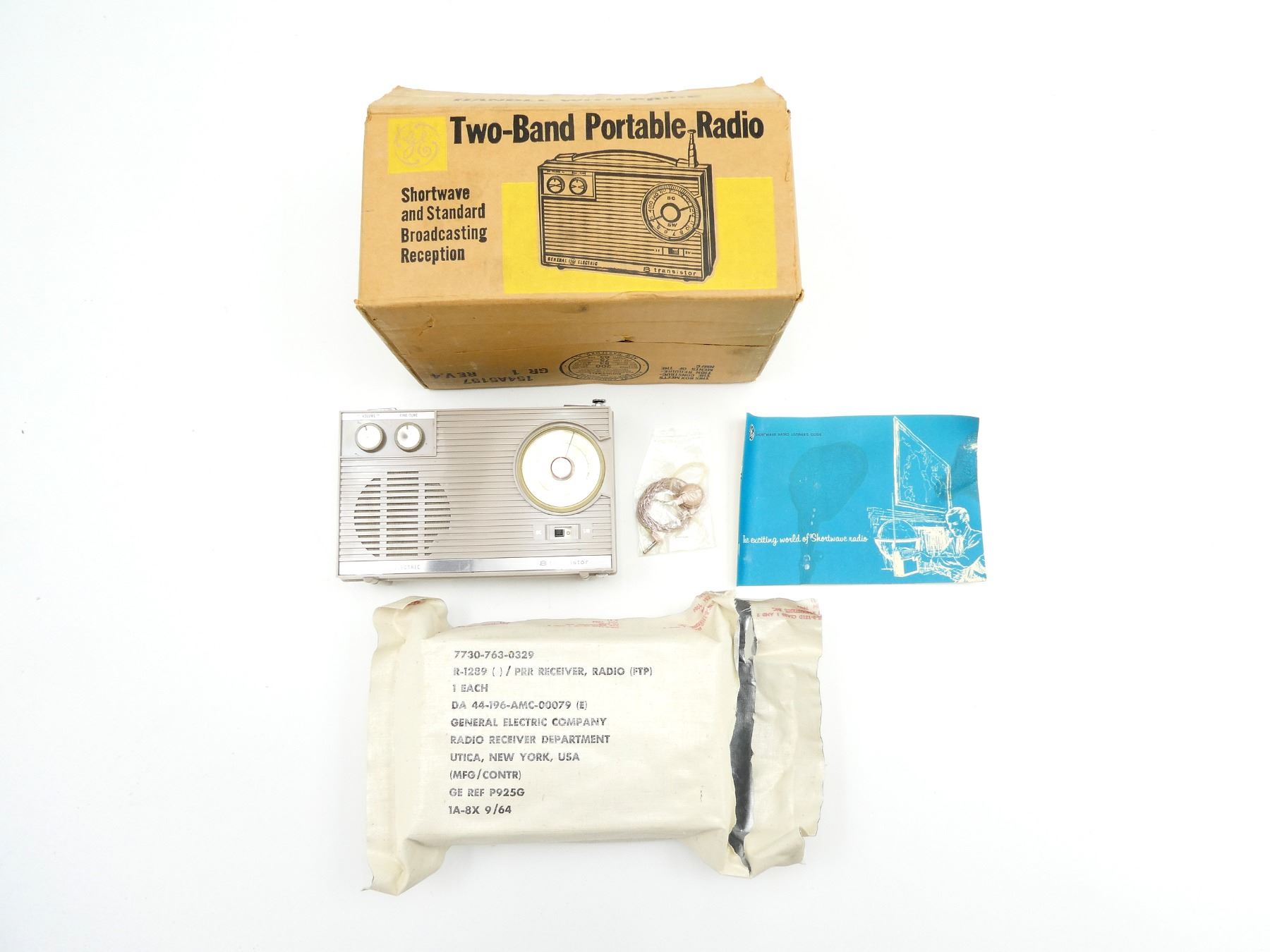 (1) GENERAL ELECTRIC (GE) PORTABLE TWO BAND RADIO, NOS, UN-OPENED PACKAGING, WITH ORIGINAL BOX, RADIO PACKAGING MARKED: "7730-763-0329, R-1289 () / PRR RECEIVER, RADIO (FTP), GENERAL ELECTRIC COMPANY, RADIO RECEIVER DEPARTMENT, UTICA NEW YORK, USA, (MFG / CONTR), GE REF P925G, 1A-8X 9/64" ETC., CONSIGNOR STATES: "1962 DATED VIETNAM ERA 'BARRACKS' SHORT-WAVE RADIO", VARIOUS MARKINGS ON OUTER BOX, BOX APPROX. 11.75" 8 5/8" X 5.75". SEE PHOTOS.