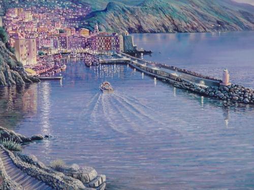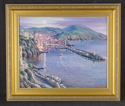This breathtaking signed limited edition print on canvas by the well-known contemporary artist Raymond Sipos - is beautifully framed and ready to hang: Title: "View of Camogli" 2001 Published by Collectors Editions Gicleé on canvas Canvas: 18 × 22 Framed size: 24 × 28 Signed by the artist LR Numbered LL Excellent condition; bright and fresh Certificate of Authenticity Raymond Sipos (United States, b. 1938) is descended from a family of Hungarian musicians and violin makers. After studying for a Bachelor of Science degree in California, he worked as a mechanisms and optics engineer before becoming a full-time artist in 1972. The artist generates ideas for his paintings by browsing through hundreds of color slides which he has developed through the years. Armed with a camera, he goes to unusual locations to photograph whatever intrigues him. Dynamic compositions and a vibrant palette are hallmarks of the work of this popular and avidly collected American artist. * * Midwest Estate Buyers is pleased to present the work of this accomplished artist at this specially affordable price. Please click on the link below to see our other auctions featuring the work of Raymond Sipos.
