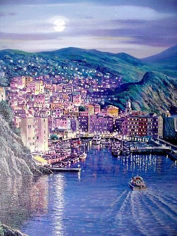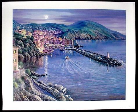 This breathtaking landscape by well-known artist Raymond Sipos offers the collector of contemporary art all of the richness and depth of an original painting at the cost of a print! Title: "View of Camogli" 2000 Published by Collectors Editions Giclée on canvas Unstretched; not framed Canvas size: 21 × 26 Image: 18 × 22 Signed by the artist LR Numbered from a total limited edition (including proofs) of 120 LL Excellent condition; bright and fresh Certificate of Authenticity Retail gallery <NOBR><A href="#">price USD</A></NOBR> 1,950 Raymond Sipos (United States, b. 1938) is descended from a family of Hungarian musicians and violin makers. After studying for a <NOBR><A href="#">Bachelor</A></NOBR> of <NOBR><A href="#">Science degree</A></NOBR> in California, he worked as a mechanisms and optics engineer before becoming a full-time artist in 1972. The artist generates ideas for his paintings by browsing through hundreds of color slides which he has developed through the years. Armed with a camera, he goes to unusual locations to photograph whatever intrigues him. Dynamic compositions and a vibrant palette are hallmarks of the work of this popular and avidly collected American artist. Midwest Estate Buyers is pleased to present the work of this accomplished artist at this specially affordable price. Please click on the link below to see our other auctions featuring the work of Raymond Sipos.