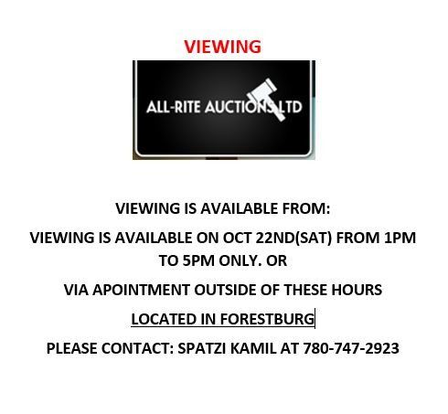 It is the purchaser's sole responsibility to make any necessary inquiries and to inspect the item before placing a bid. Viewing is available by appointment, please contact All-Rite Auctions at 1-780-747-2923 or 1-780-881-4184.