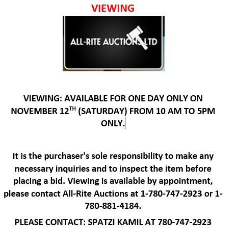 It is the purchaser's sole responsibility to make any necessary inquiries and to inspect the item before placing a bid. Viewing is available by appointment, please contact All-Rite Auctions at 1-780-747-2923 or 1-780-881-4184.