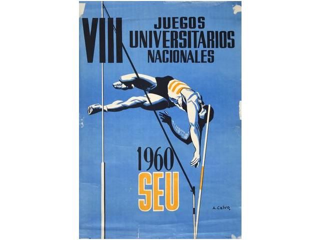 VIII JUEGOS UNIVERSITARIOS NACIONALES. CALVO. 1960. 69x48 cm. (27,7x18,9 in.). Litografía. B-. Ruan. DEPORTES. Rasgadura sin falta y papel montado en las esquinas.