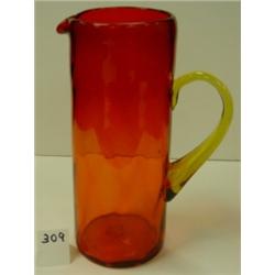 Viking? Pilgrim? Orange pitcher with yellow applied handle. 9.75" tall. Condition: Excellent