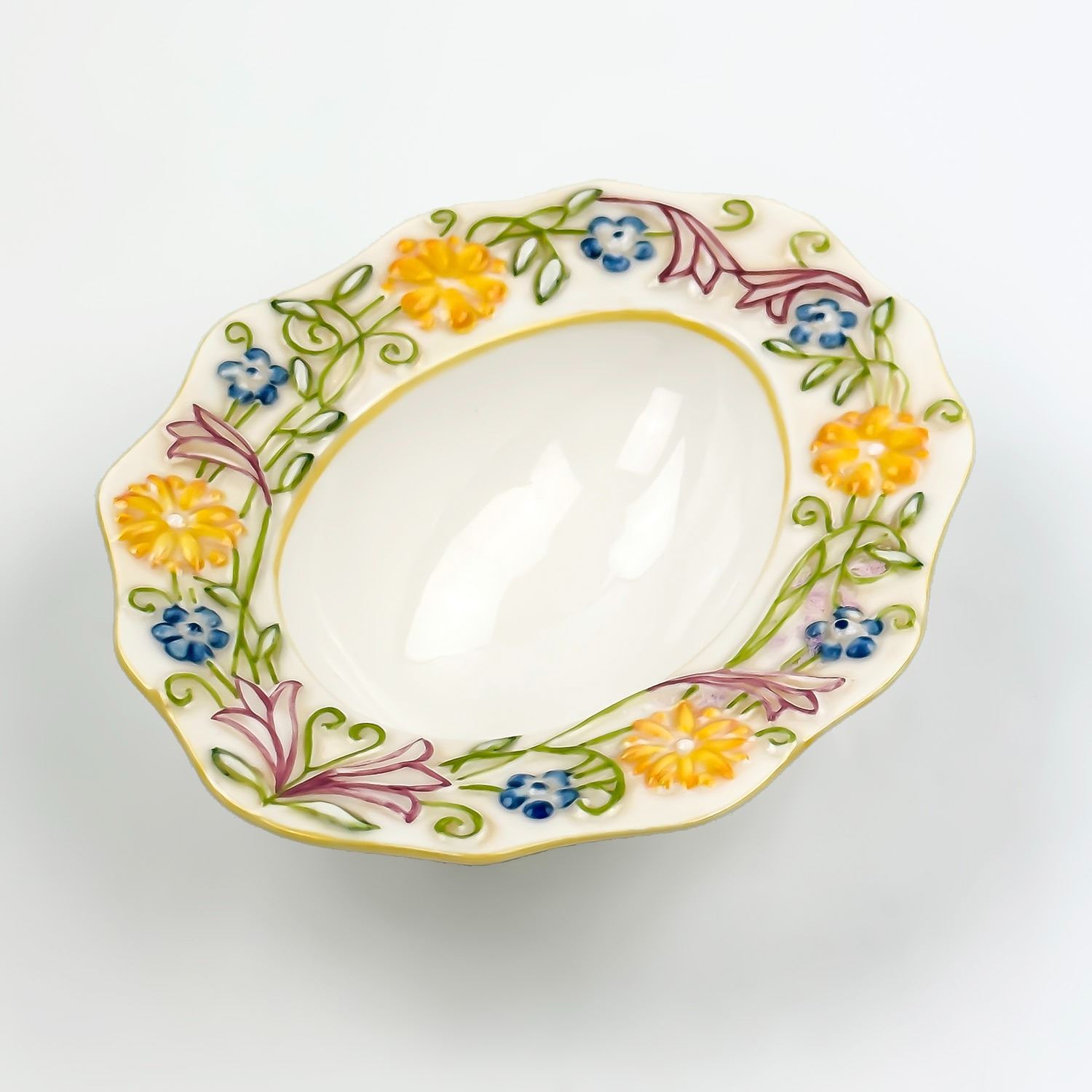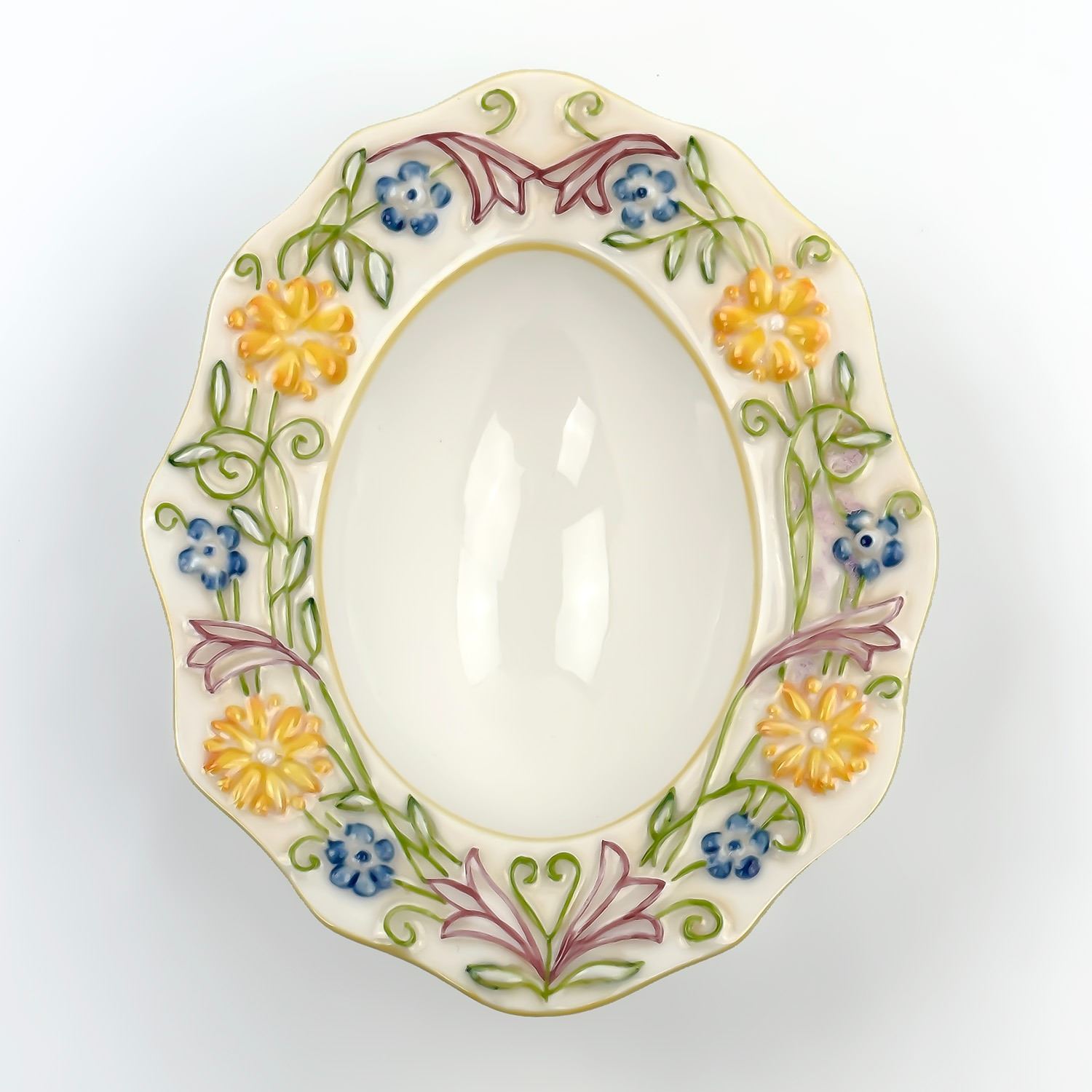 #8072 - FLORAL THEMED EDGES. THE EGG SHAPE PORTION IS APPROXIMATELY THE SIZE OF A DUCK EGG… MAYBE LARGER - NOT CHICKEN EGG SIZE. MEASURES: 5.75” (14.5 CM) LONG BY 4.75” (12 CM) WIDE AND SITS 1.5” (4 CM) HIGH. EGG SHAPE PORTION IS 3.5” (9 CM)LONG BY***ITEM(S) LOCATED IN LETHBRIDGE ALBERTA. FREE TRANSPORT TO EDMONTON OFFICE AVAILABLE FOR THIS AUCTION. WORLDWIDE SHIPPING IS AVAILABLE FOR ALL ITEMS