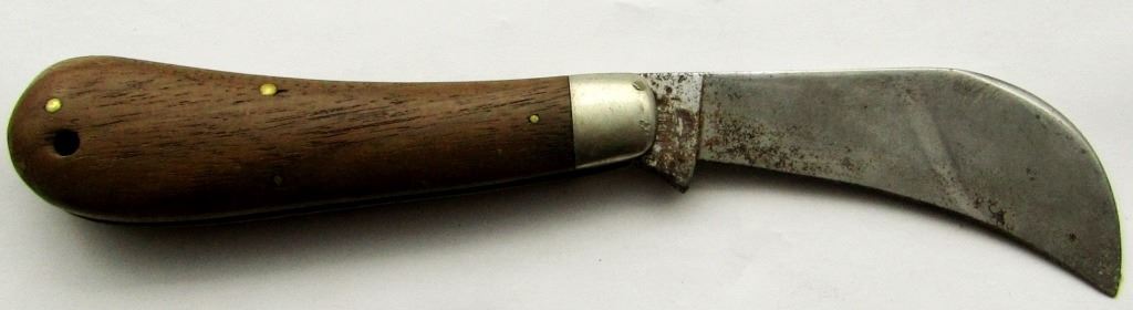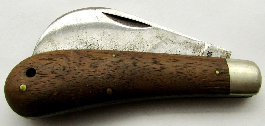 WOOD HANDLE. NEEDS A VERY GOOD CLEANING TO REMOVE SOME SURFACE RUST. NO WOBBLE BUT WEAK SNAP. CLEANING MAY RESTORE SNAP.