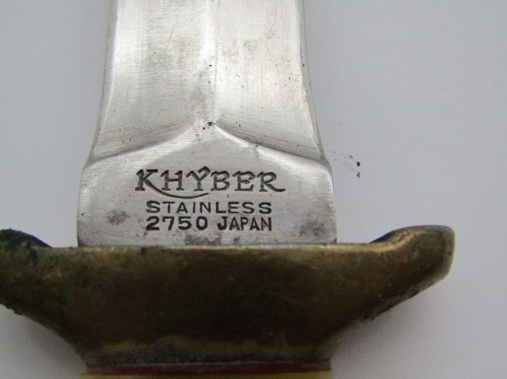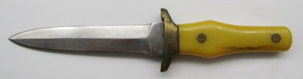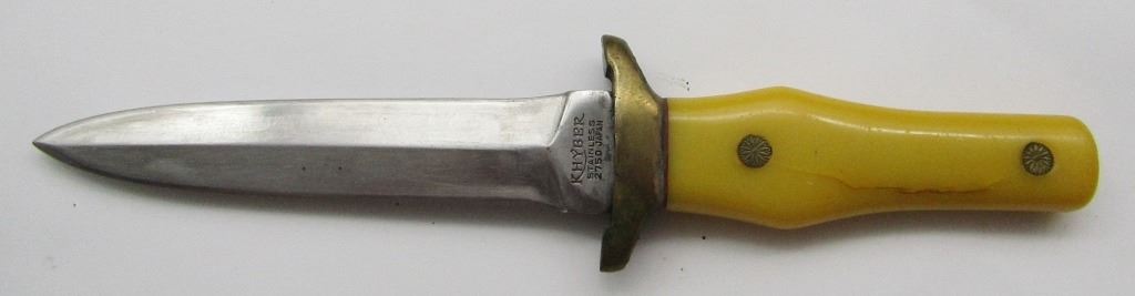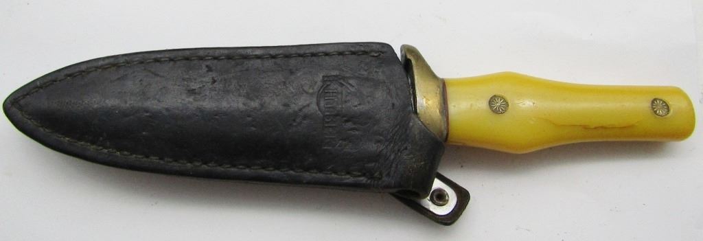 WITH SHEATH. YELLOW HANDLE. NEEDS CLEANED AND HAS BEEN SHARPENED BUT IN GOOD CONDITION. BLADE IS ABOUT 5" LONG.