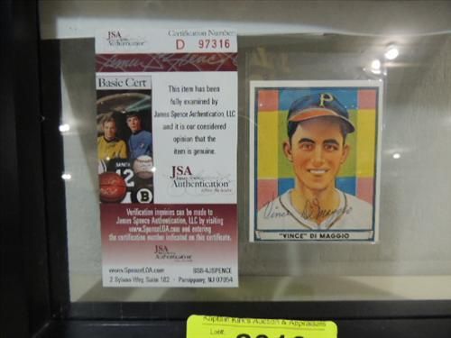 VINCE DIMAGGIO SIGNATURE AUTOGRAPH ON SPORTS CARD. INCLUDES COA FROM JAS #D97316. AS SHOWN. VIEW PICTURE FOR DETAIL. PLEASE BE ADVISED, AND INFORMED REGARDING SIGNATURES OR AUTOGRAPHS THAT WE SELL AT AUCTION: WE ARE NOT AUTHENTICATORS, AND WE DO NOT AUTHENTICATE, OR VALIDATE ANY AUTOGRAPHS OR SIGNATURES THAT WE OFFER AT AUCTION. SOME AUTOGRAPHS OR SIGNATURES MAY COME WITH AN AUTHENTICATION FROM ANY ONE OF LITERALLY HUNDREDS OF AUTHENTICATORS ACROSS THE COUNTRY, AND AROUND THE WORLD. WE DO NOT ENDORSE ANY AUTHENTICATOR, NOR DO WE GUARANTEE THAT ANY AUTOGRAPH OR SIGNATURE IS AUTHENTIC, OR THAT IT WILL PASS AUTHENTICATION BY ANY AUTHENTICATOR. ALL AUTOGRAPHS OR SIGNATURES ARE SOLD