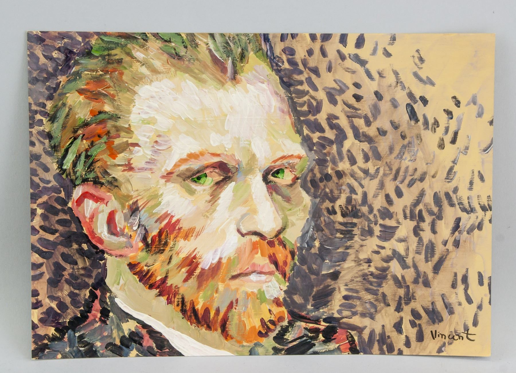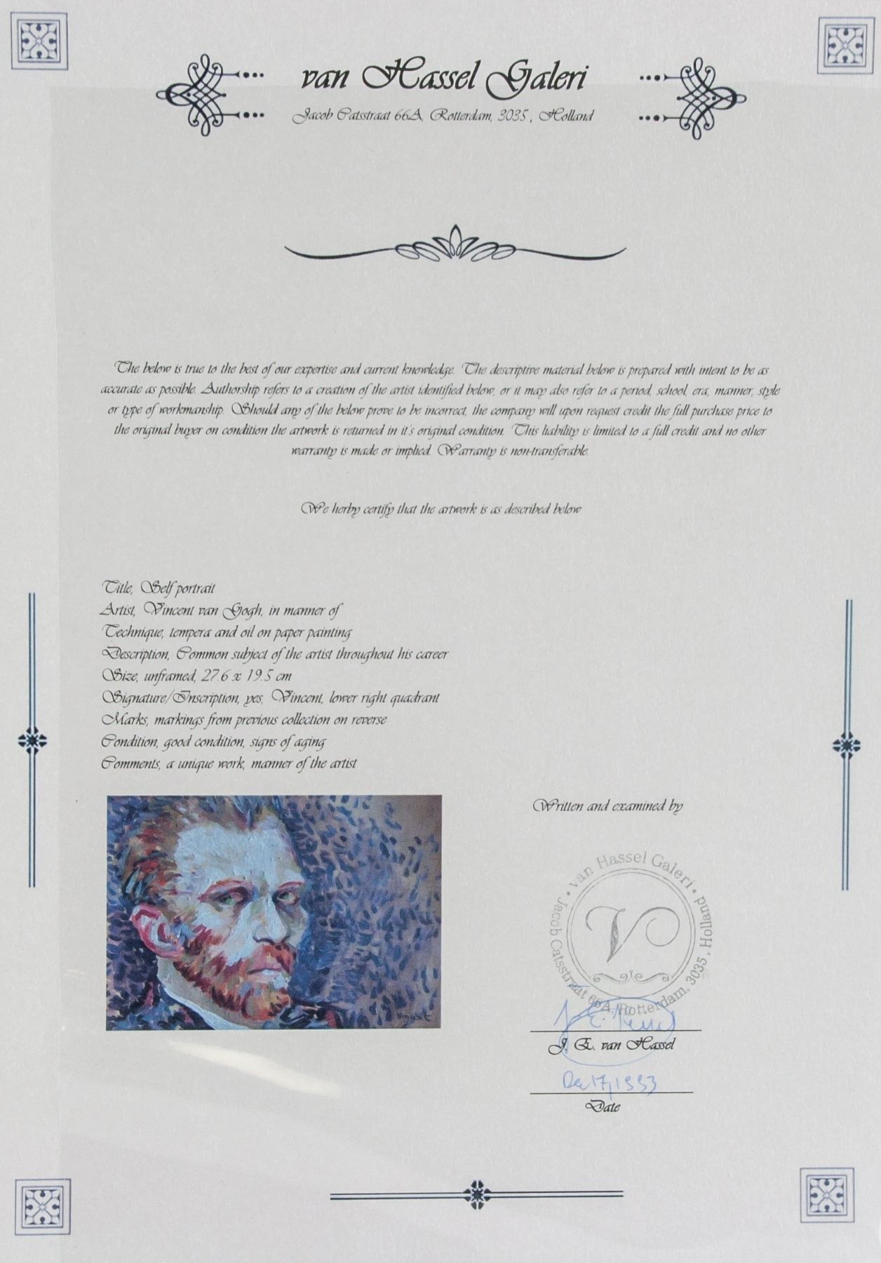 Tempera and oil on paper. Featuring self-portrait. Signed and attr. Vincent Van Gogh (Dutch, 1853-1890 ) on the lower right corner. 10.8 x 7.7 in. (27.5 x 19.5 cm). Accompanied with a certificate. Primarily self-taught and unappreciated during his lifetime, Vincent van Gogh made over 900 paintings and 1,100 works on paper during the decade that he worked as an artist. Influenced by Jean-Francois Millet and the Barbizon School artists, van Gogh’s early work comprises dour portraits of Dutch peasants and depressing rural landscapes. In 1886-88 he moved to Paris, where Impressionism and Neo-Impressionism had a big impact on his painting. He brightened his palette, experimented with shorter brush strokes, impasto, and complementary colors. The paintings he made in Paris announce the bolder Post-Impressionist style that he is best known for today. Emotionally unstable, humorless, and argumentative, van Gogh eventually had a breakdown and moved to an asylum in the south of France where he painted landscapes, portraits, interiors and still life's steeped with personal symbolism. PROVENANCE: Private American collection