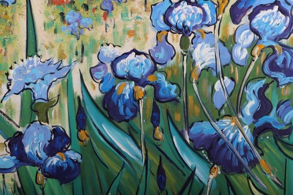 Vincent Van Gogh (1853-1890, Dutch) original Irises acrylic painting in the manner of, after the time of Van Gogh. This is an original artwork created by an unknown artist in the same style and technique as Vincent. Vincent was a Post-Impressionist painter who is among the most famous and influential figures in the history of Western art. In just over a decade, he created approximately 2100 artworks, including around 860 oil paintings, most of them in the last two years of his life.