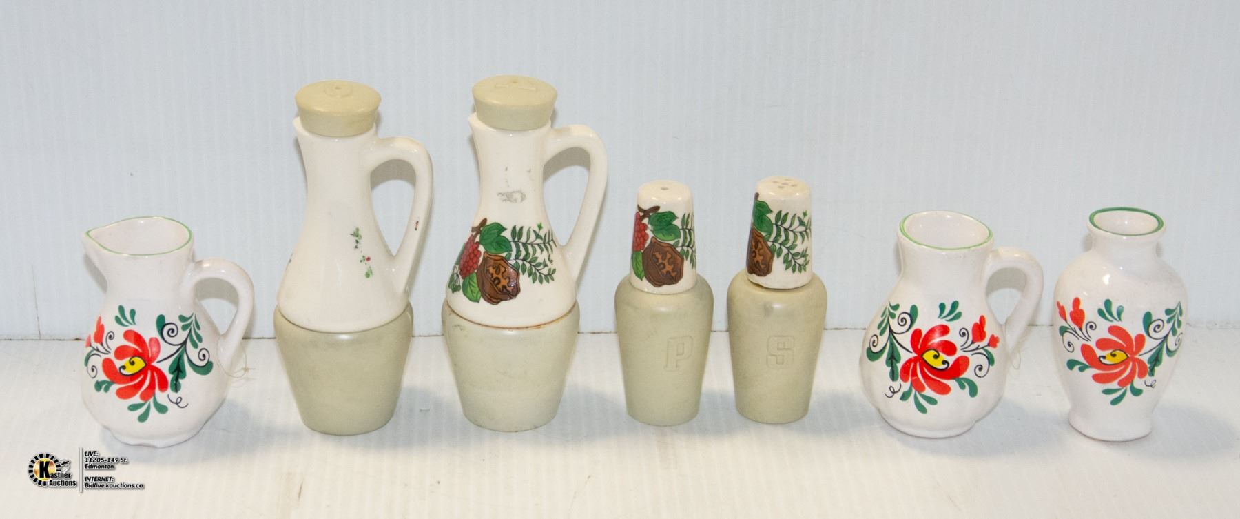 VINEGAR, OIL, S+P SHAKERS & 3 MINI VASES/JUGS