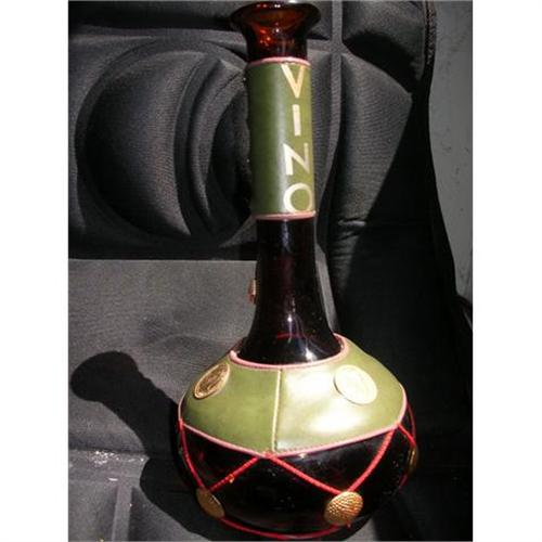 This interesting wine bottle has three coin-like symbols with "1883 Alfonso XII Por Lac De Dios" and a face on them. The base is covered in the same green leather that holds the 3 symbols of 1883 Alfonso XII head on the sides. The red cord is intricately interlaced with the green leather. I am sure it will speak to the avid collector.