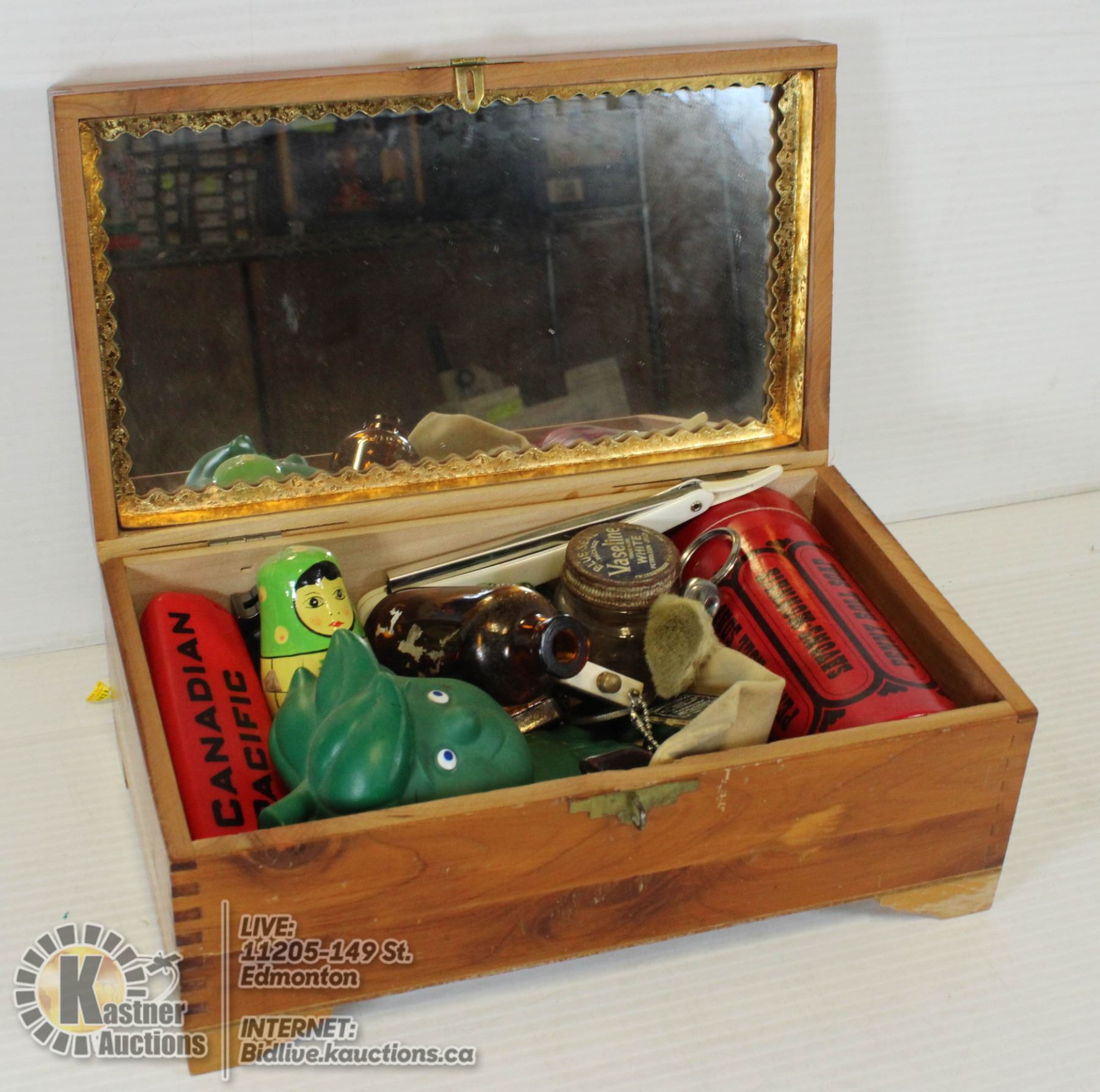 VINT. WOODEN BOX FILLED WITH COINS, ANTIQUES,