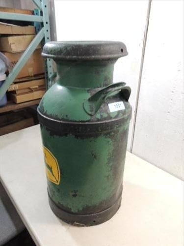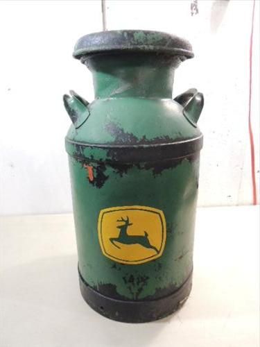 VINTAGE 10 GALLON MILK CAN PAINTED JOHN DEERE LOGO. AS SHOWN. AS SHOWN. VIEW PICTURE FOR DETAIL.
