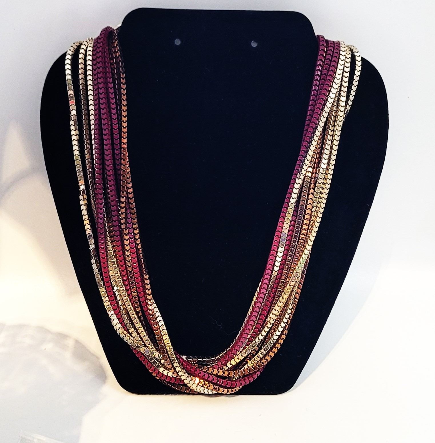 WITH SILVER TONE, COPPER TONE AND BURGANDY, 16" WITH A 3" EXTENSION CHAIN, CAN BE WORN TWISTED OR FLAT