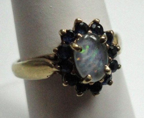 Ring is in pre-owned condition condition and needs a light buffing to make like new. The opal doublet measures 7.5mm x 5.5mm. There are 12 commercial grade sapphires measuring 3mm each.
