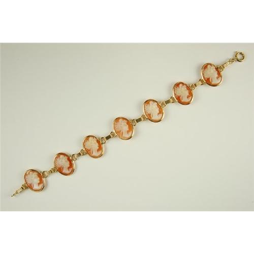 VINTAGE 14k Yellow GOLD CAMEO BRACELET featuring 7 Oval CAMEOS. Each Cameo features the profile of a young pretty woman. The bracelet is 7 inches in length and it is 5/8" in width.
