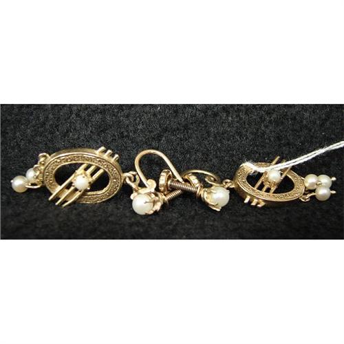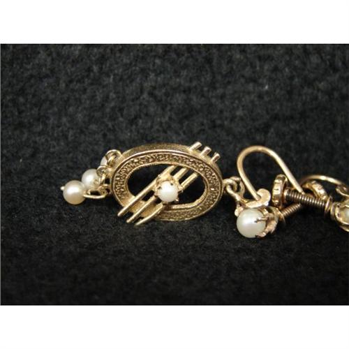 PAIR OF VINTAGE 14K GOLD PEARL EARRINGS. Screw-back chandelier earrings in 14K gold each set with 5 pearls. Approx. 33mm drop.