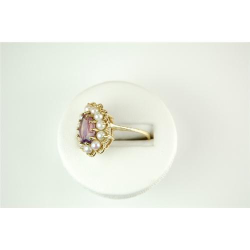 This Beautiful Ring is 14k Yellow Gold and it features a Pearshaped AMETHYST = 1.50 CARATS! The AMETHYST is a rich 'DEEP PURPLE' in color and it is surrounded by 11 WHITE CULTURED PEARLS. This ring is a Size 6 and it can be resized either larger or smaller. It is in EXCELLENT CONDITION.