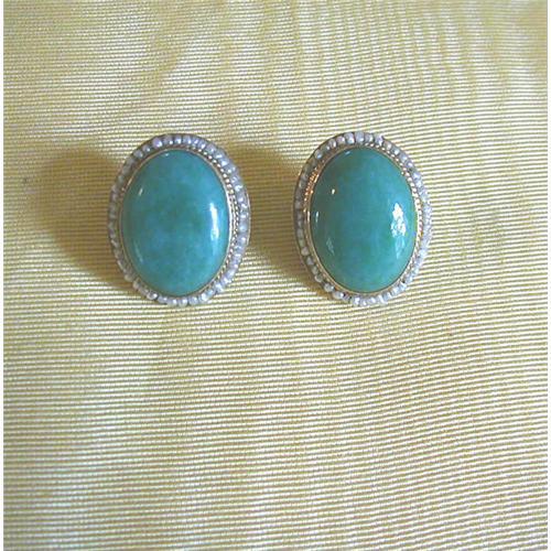 A pair of just wonderful vintage jade earrings ... bezel set in 14K yellow gold with a border of natural seed pearls. The earrings are 1" long ovals and are 3/4"+ wide at wide point. They are for pierced ears ( see back image ) STAMPED: 14K ... Mint Condition ...they go beautifully with the jade beads in another of our listings. ( see last image of the beads ) BURTON BROOK FARM ANTIQUES for great estate gems.