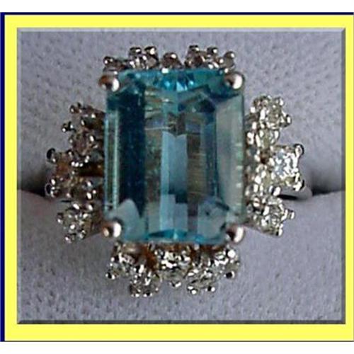 1 Emerald cut blue Topaz measures 10X8mm. 20 round diamonds total 60/100 carat. Beautifully set. Great quality. We are not gemologists, but stone appears to