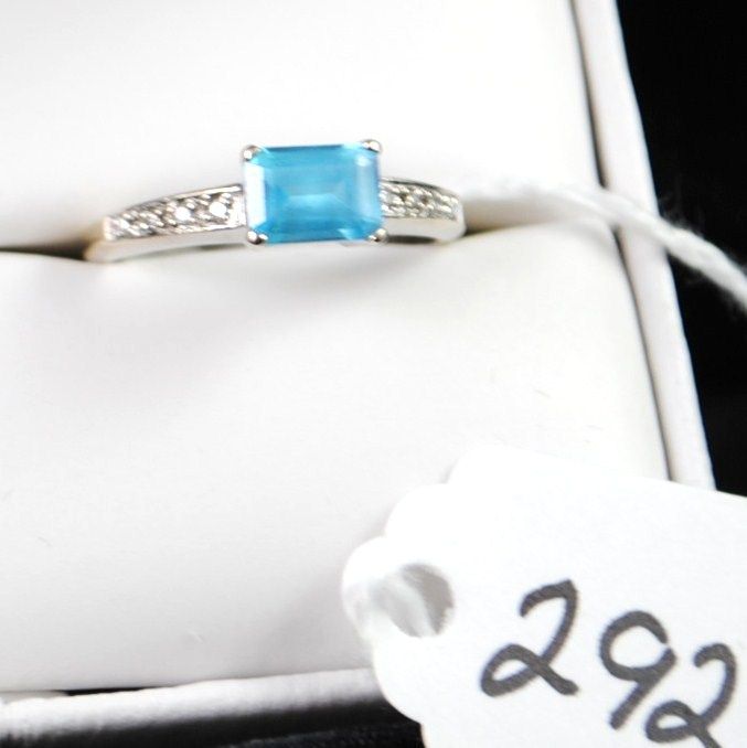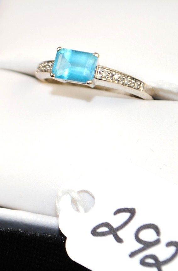 VINTAGE 14K WHITE GOLD BLUE TOPAZ AND DIAMOND RING WITH ONE EMERALD CUT BLUE TOPAZ CENTER AND DIAMOND ACCENTS ON THE RING SHOULDER - WEIGHS 2.4 GRAMS - APPRAISED RETAIL REPLACMENT IS $750.00
