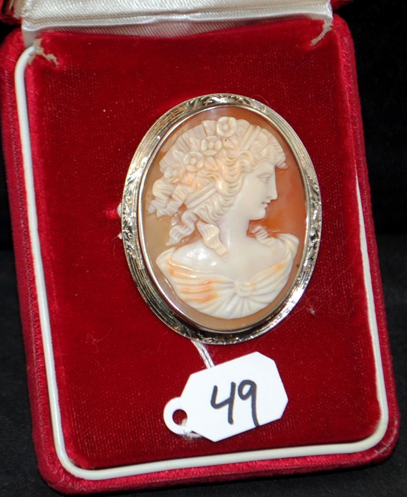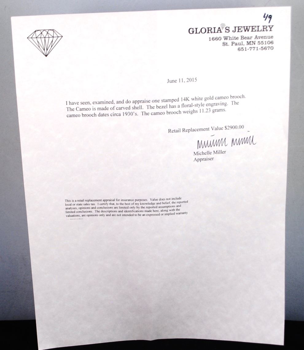 VINTAGE 14K WHITE GOLD CAMEO BROOCH. THE CAMEO IS MADE OF CARVED SHELL THE BEZEL HAS A FLORAL-STYLE ENGRAVING. THE CAMEO BROOCH DATES CIRCA 1930'S. THE RETAIL REPLACEMENT VALUE IS $2,900.00. AND COMES WITH THE