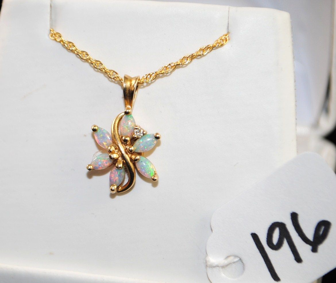 VINTAGE 14K YELLOW GOLD OPAL & DIAMOND PENDANT WITH SIX MARQUISE CUT OPALS AND ONE ACCENT DIAMOND - WEIGHS 1.6 GRAMS - APPRAISED RETAIL REPLACEMENT IS $1,175.00 - COMES WITH THE JEWELERS APPRAISAL CARD FOR INSURANCE