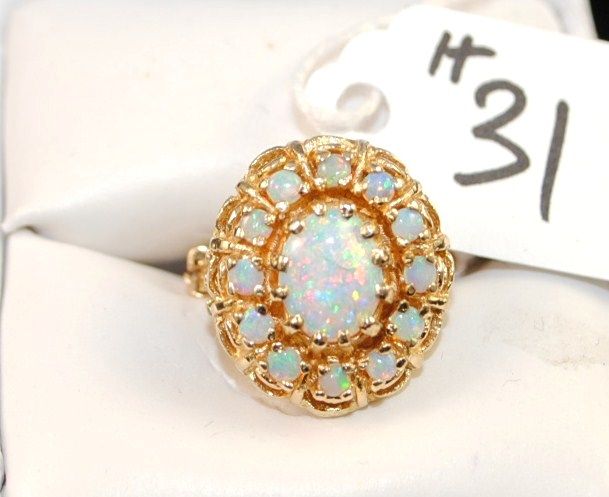 VINTAGE 14K YELLOW GOLD OPAL RING SET WITH ONE LARGE OVAL CAPACHON OPAL AND SURROUNDED WITH TWELVE ROUND OPALS - WEIGSH 8.0 GRAMS - APPRAISED RETAIL REPLACEMENT IS $2,500.00 - COMES WITH THE JEWELER APPRAISAL CARD!