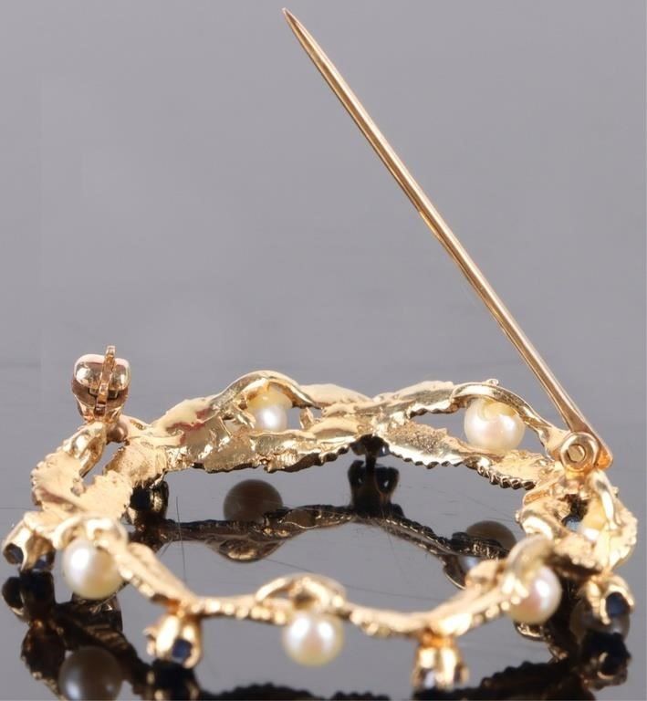 Vintage 14k yellow gold pearl sapphire ladies brooch. With six 5.0-4.0mm pearls
