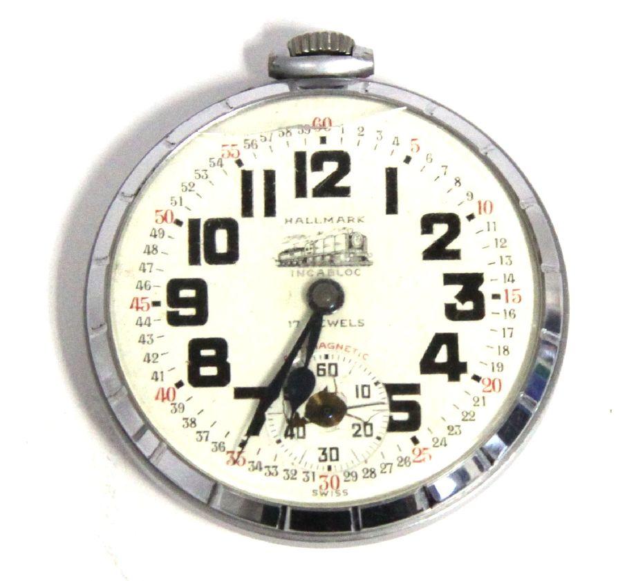 Vintage railroad pocket watch. Marked "Hallmark Incabloc". Small crack at top, does not appear to be running. Movement: 17 jewel