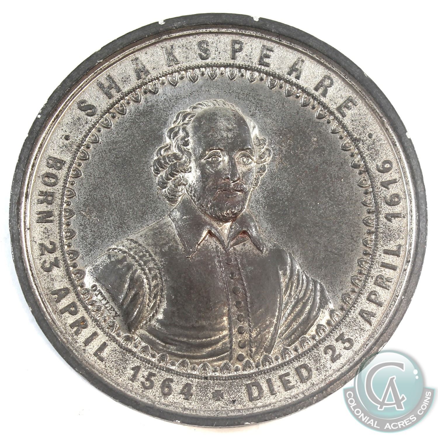 VINTAGE 1864 Shakespeare Born April 23, 1564 Died April 23, 1616 'The Tercentenary of the Birth of Shakespeare Celebrated April 23, 1864 Medal. 52mm diameter.