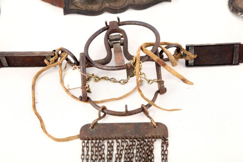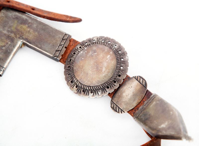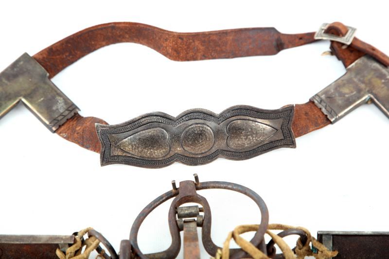 This is an early-20th century hand-tooled leather, unmarked, and unpolished Navajo horse headstall bridle with hand-pounded side conchos and bit, all fully intact.