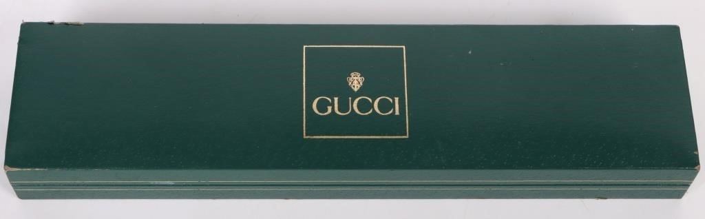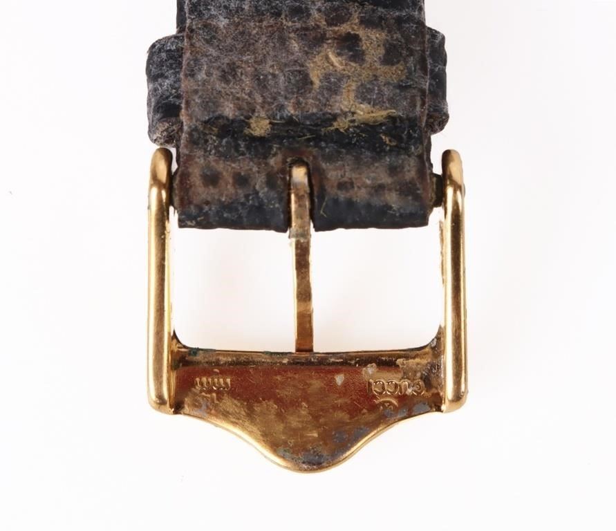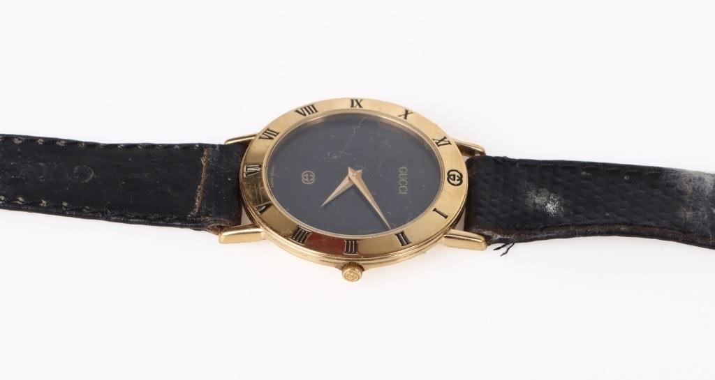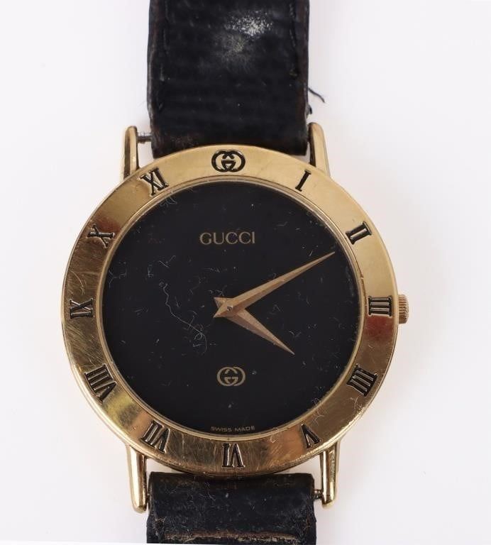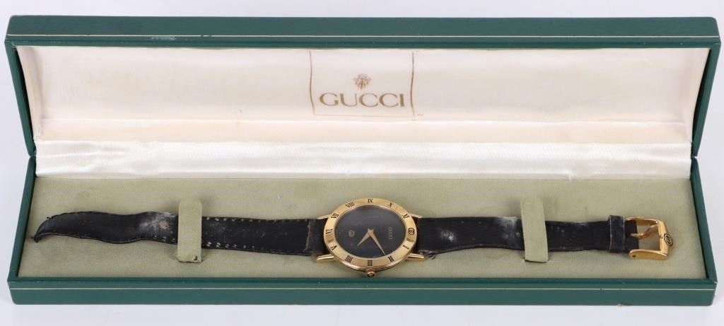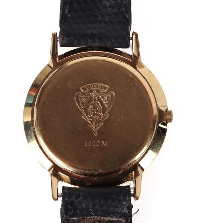 Vintage 18K gold plated Gucci 3000M men's wristwatch to include an 18K plated case crown and back, 3000M quartz, a black lizard grain leather strap and the original Gucci branded case for the watch.