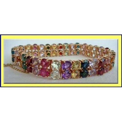 The bracelet consists of a double row of matched pairs of stones ranging in colour from yellow, orange, through greens, pinks, purples to deep red. Beautifully set in a gold mount - see the photos of the back for details and quality of workmanship. A gold safety chain for added security.