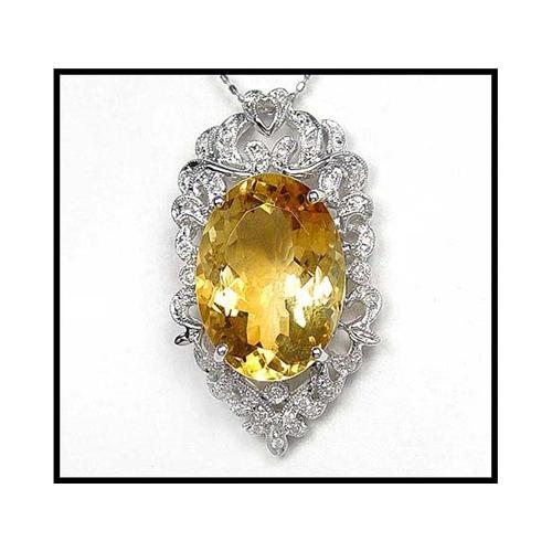 A 10 carat fine color natural citrine exhibits amazing brilliance. As set in the solid 18K white gold pendant, it has lovely contrast and harmony from 38 full cut diamonds. A master goldsmith has faithfully crafted this magnificent jewel from a vintage design. The outcome has proven worth the long hours invested. It measures 33mm (1 5/16") long x 19mm (3/4") wide. No chain. Was fairly priced for $900.
