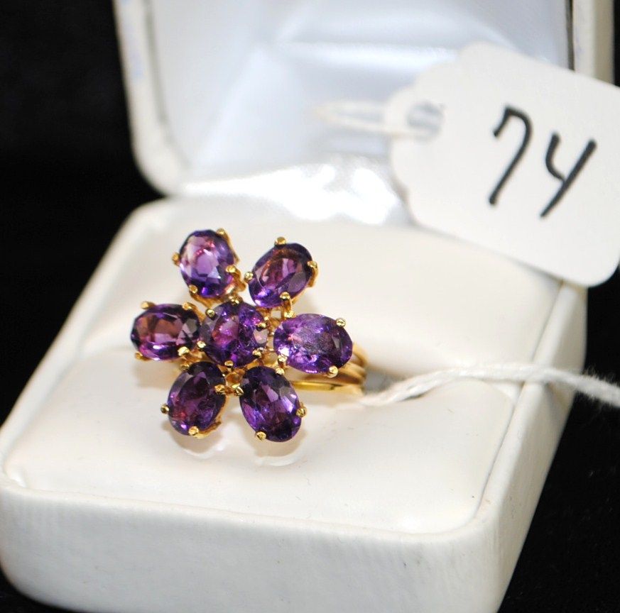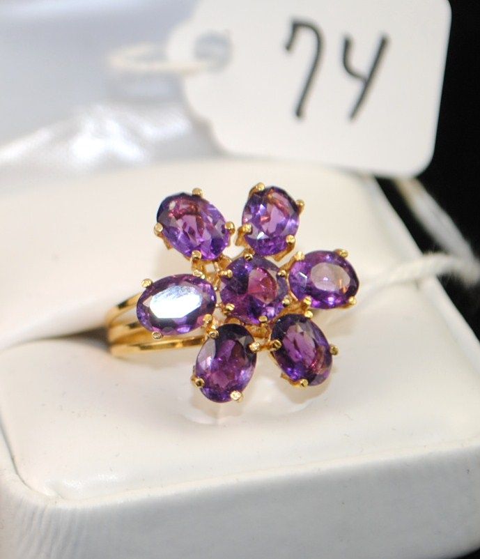 VINTAGE 18K YELLOW GOLD AMETHYST RING WITH ONE ROUND AND SIX OVAL CUT AMETHYSTS - APPRAISED RETAIL REPLACEMENT IS $1,950.00 - COMES WITH THE JEWELERS APPRAISAL CARD FOR INSURANCE