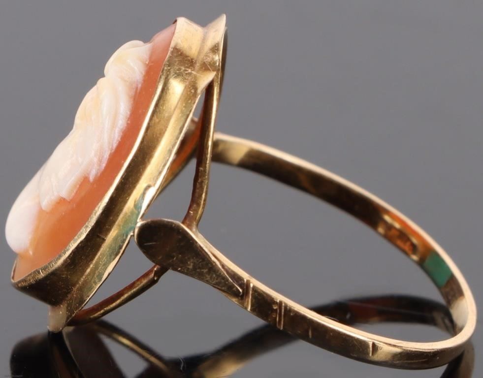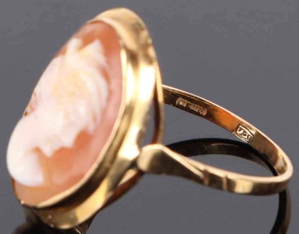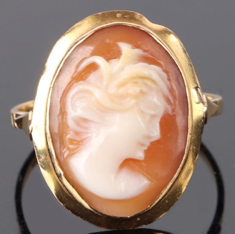 Vintage 18K yellow gold cameo solitare ladies ring to include an enamel carved portrait of a lady