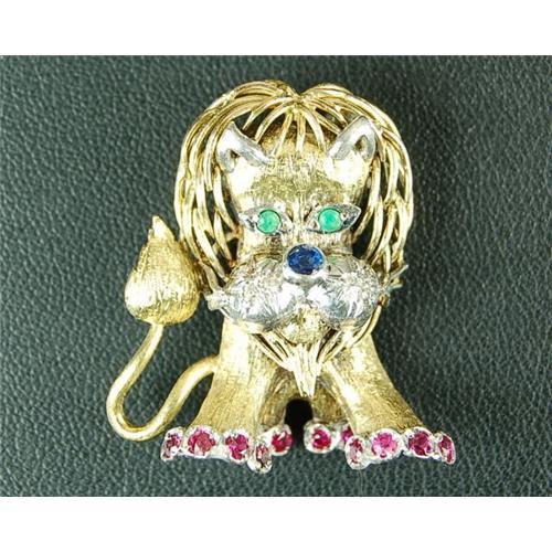 This Magnificent Pin came to us from an Estate filled with the Finest Jewelry. It is a Vintage 18K GOLD Pin of a LION set with RUBYS, DIAMONDS, SAPPHIRE, and JADES. The Lion measures 1 1/4 inch in height and 1 inch across. This is a VERY WELL MADE BROOCH with extraordinary DETAIL!