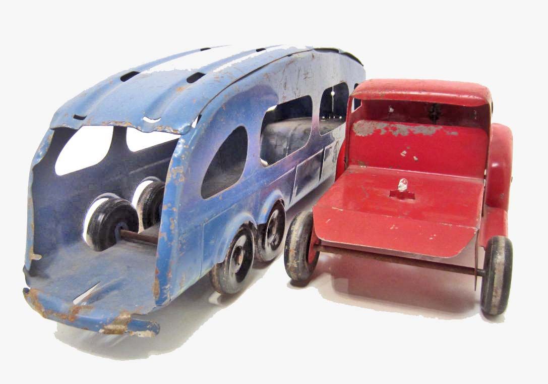 Constructed with pressed steel. Measures approx 22" long. Shows wear and some scrapes to the edges and roof and metal tires show some wear. Missing ramp. No manufacturer marks but marked Made in USA