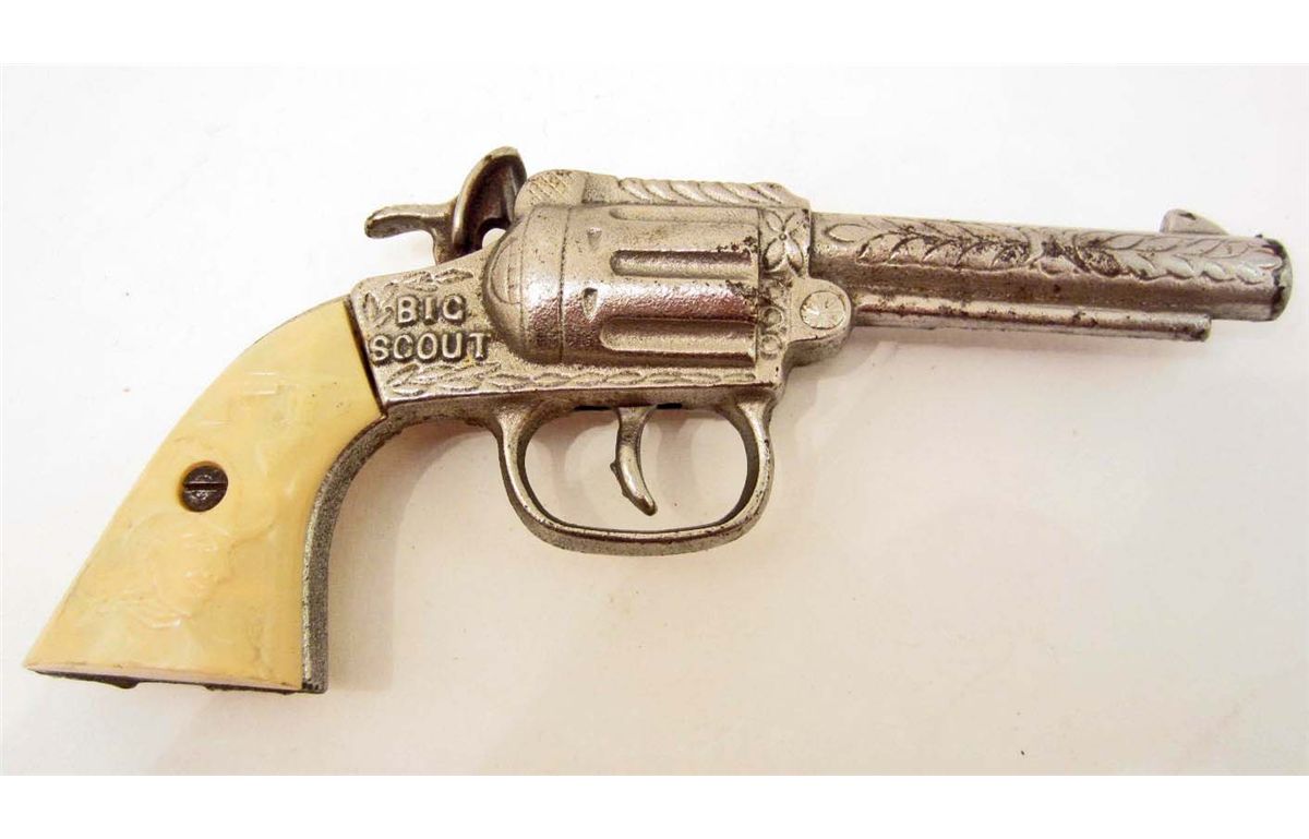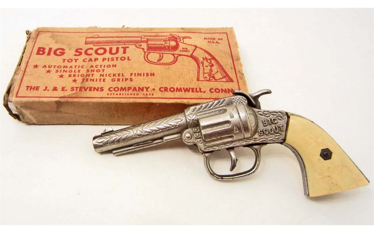 VINTAGE 1940'S JE STEVENS BIG SCOUT CAST IRON CAP GUN W/BOX