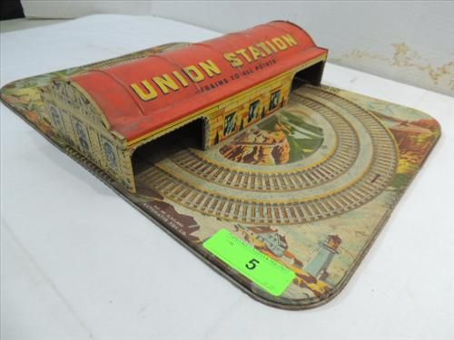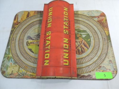 VINTAGE 1950'S AMERICAN TOY CO UNION STATION PRESSED METAL TRAIN STATION. NO TRAIN CARS. GRAPHIC IN GOOD CONDITION. AS SHOWN. VIEW PICTURE FOR DETAIL.