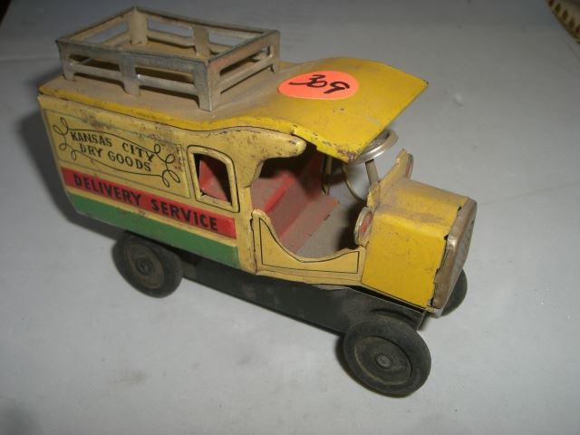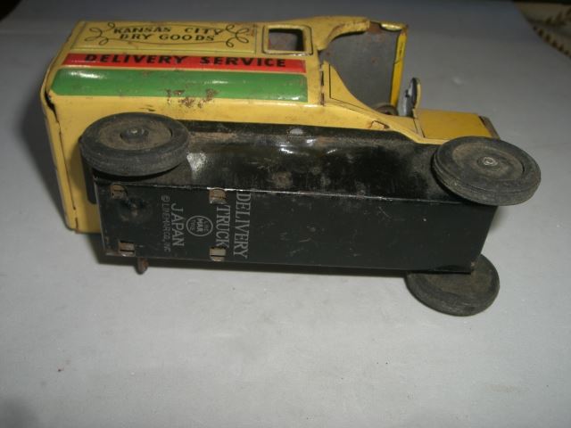 VINTAGE 1950'S TRUCK *VERY RARE-FRICTION POWERED* METAL TIN TOY STAMPED *JAPAN-LINEMAR CO* LOGOS ARE *KANSAS CITY DRY GOODS DELIVERY SERVICE!! ONLY MISSING 1 REAR WHEEL. TOY CAME OUT OF SAFE!! ***Coin, Currency & All Items Listed in this auction - Grades, Conditions and Values are not Safe Deposit Coins LLC Responsibilty. Grades, Condition and Values are determined by Consigner(s) & Buyers