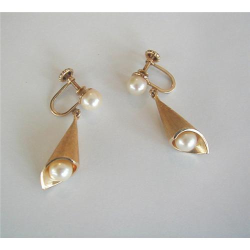 1950's CLASSIC 14K YELLOW GOLD AND FINE CULTURED PEARL HANGING EARRINGS / The conical gold swinging tubes have a brushed gold finish with high polish interior. The 14k screw backs are classic 50's. The earrings are 1 1/4 inches suspended from the pearl / STAMPED: 14K