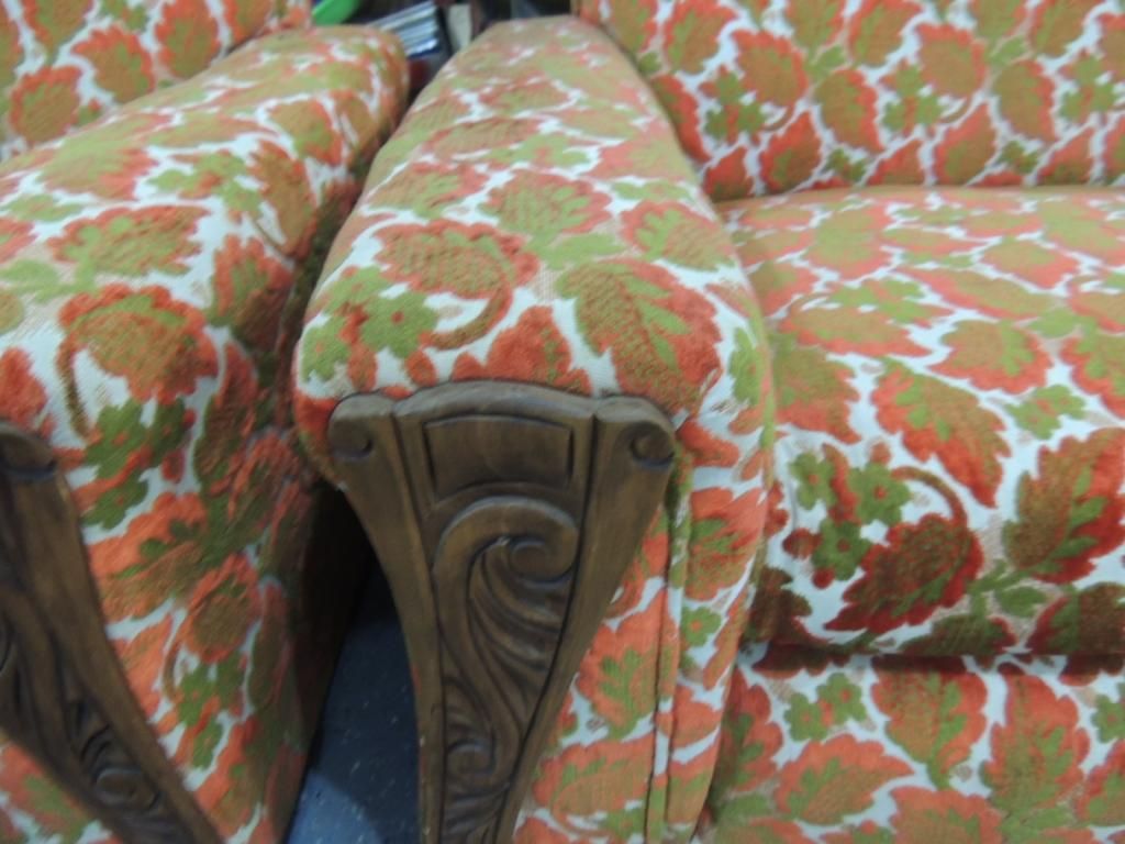 SOFA AND CHAIR VINTAGE 1950S UPHOLSTERED RED AND GREEN LEAF DESIGN. AS SHOWN. SEE PHOTO FOR MORE DETAILS.