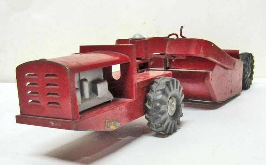Constructed from pressed steel ,measures approx 22" long. Includes hard to find plastic motor. Decal is in fair condition. Shows wear from age and play. Missing driver's seat and smokestack.