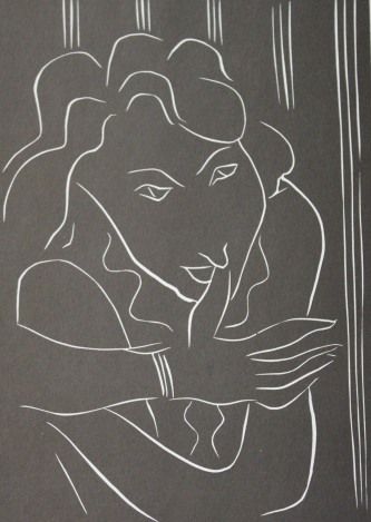HENRI MATISSE "WOMAN WITH HAND TO NOSE" - VINTAGE LITHOGRAPH AFTER THE 1945 LINOCUT - PRINTED IN 1956 - PUBLISHED BY GEORGE BRAZILLER NEW YORK - PROFESSIONALLY FRAMED AND MATTED - GALLERY STYLE WITH BLACK ACID FREE MAT AND SOLID WOOD BLACK FRAME - SHEET 11"X 8" - IMAGE APPX 7" X 5"