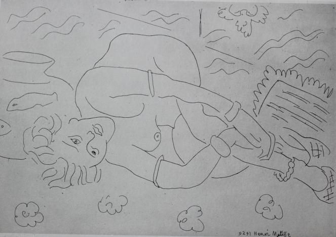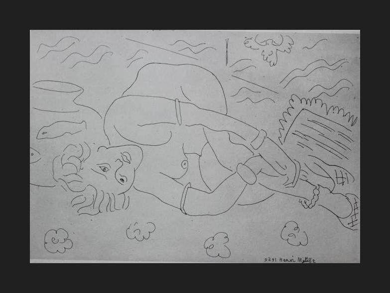 HENRI MATISSE "RECLINING NUDE WITH A GOLDFISH BOWL" - VINTAGE LITHOGRAPH AFTER THE 1929 ETCHING - PRINTED IN 1956 - PUBLISHED BY GEORGE BRAZILLER NEW YORK - PROFESSIONALLY FRAMED AND MATTED - GALLERY STYLE WITH BLACK ACID FREE MAT AND SOLID WOOD BLACK FRAME - SHEET 11"X 8" - IMAGE APPX 4.75" X 6.75"