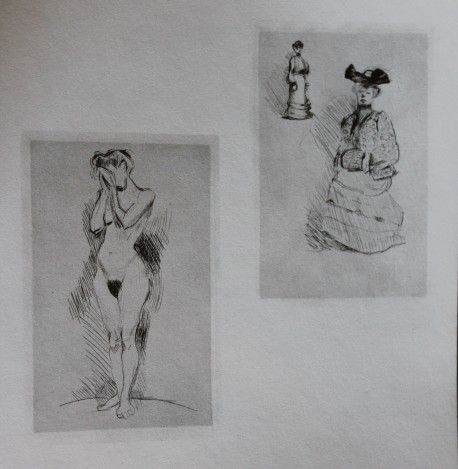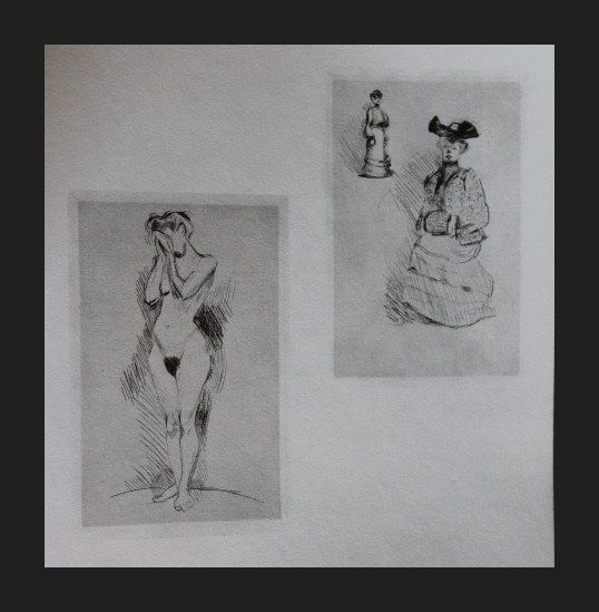HENRI MATISSE "NUDE" & "STUDIES OF A WOMAN IN STREET COSTUME" - VINTAGE LITHOGRAPH AFTER THE 1903 DRYPOINT ETCHINGS - PRINTED IN 1956 - PUBLISHED BY GEORGE BRAZILLER NEW YORK - PROFESSIONALLY FRAMED AND MATTED - GALLERY STYLE WITH BLACK ACID FREE MAT AND SOLID WOOD BLACK FRAME - SHEET 11"X 8" - EACH IMAGE APPX 3.25" X 5"