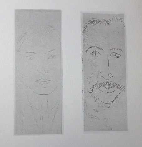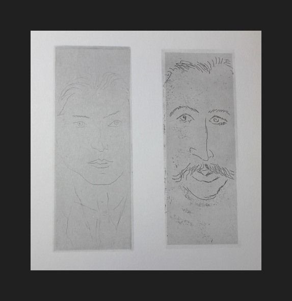 HENRI MATISSE "OLIVARES" & "WALTER PACH" - VINTAGE LITHOGRAPH AFTER THE 1914 ETCHINGS - PRINTED IN 1956 - PUBLISHED BY GEORGE BRAZILLER NEW YORK - PROFESSIONALLY FRAMED AND MATTED - GALLERY STYLE WITH BLACK ACID FREE MAT AND SOLID WOOD BLACK FRAME - SHEET 11"X 8" - EACH IMAGE APPX 5.5" X 2"