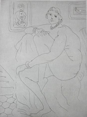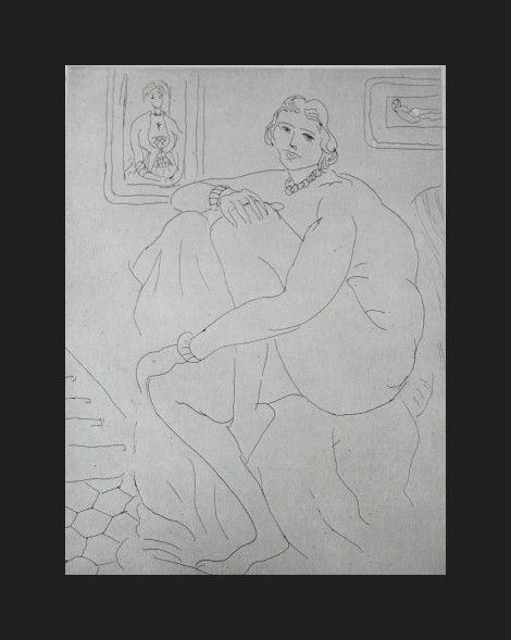 HENRI MATISSE "SEATED NUDE WITH PICTURES" - VINTAGE LITHOGRAPH AFTER THE 1929 ETCHING - PRINTED IN 1956 - PUBLISHED BY GEORGE BRAZILLER NEW YORK - PROFESSIONALLY FRAMED AND MATTED - GALLERY STYLE WITH BLACK ACID FREE MAT AND SOLID WOOD BLACK FRAME - SHEET 11"X 8" - IMAGE APPX 6" X 5"